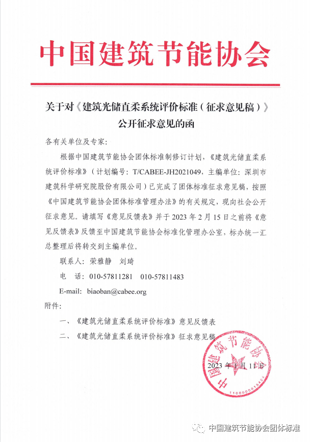 关于对《建筑光储直柔系统评价标准(征求意见稿)》公开征求意见的函