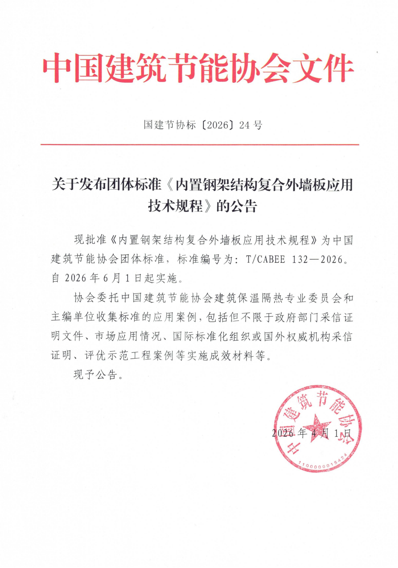 现批准《内置钢架结构复合外墙板应用技术规程》为365体育彩票:团体标准,标准编号为:T/CABEE 132—2026。自2026年6月1日起实施。